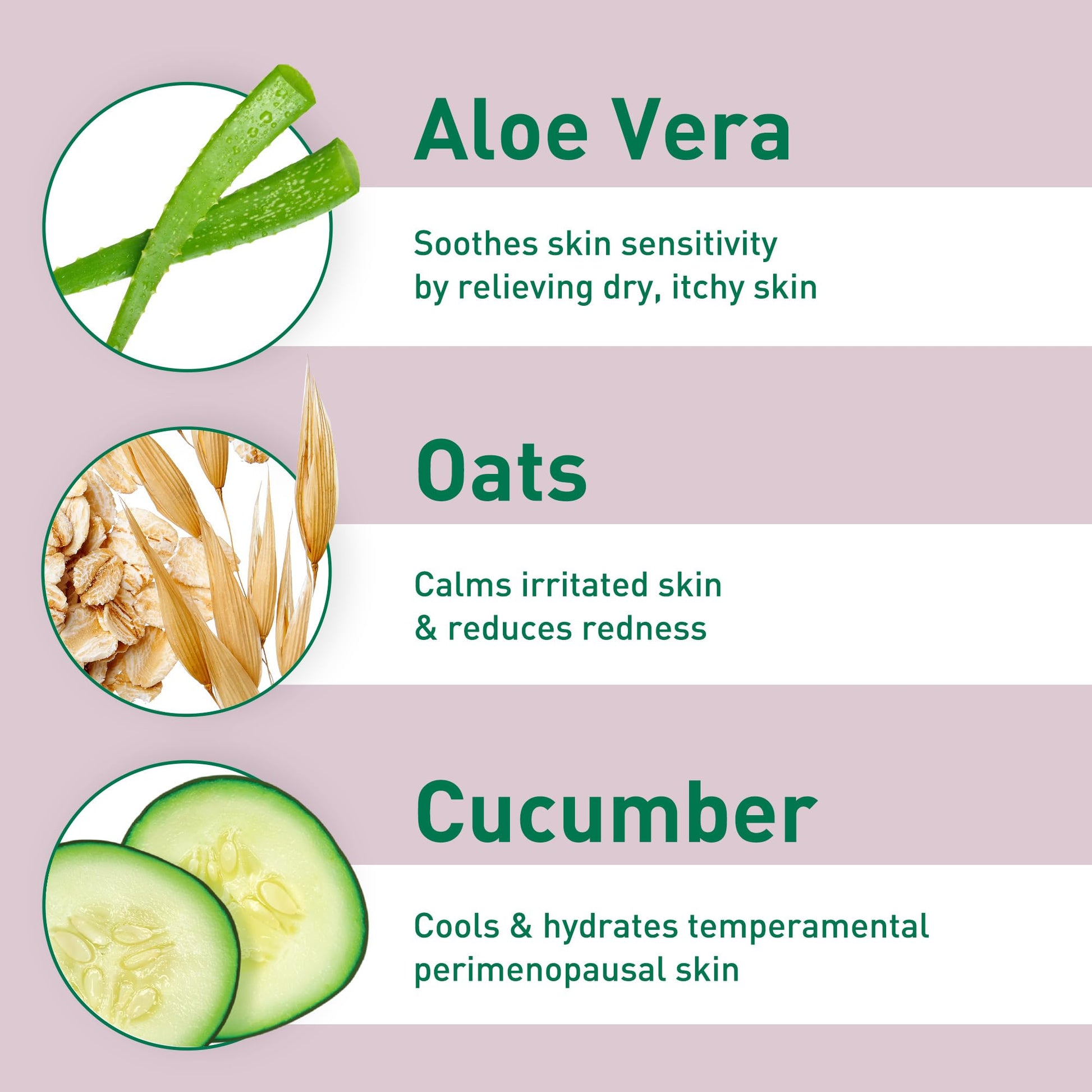 - Our signature Biome Balance Blend of Aloe Vera, Cucumber, and Oatmeal extract helps soothe dry, irritated skin. It also helps rebalance the natural pH to preserve the skin’s delicate microbiome while also reducing redness.